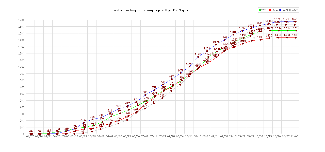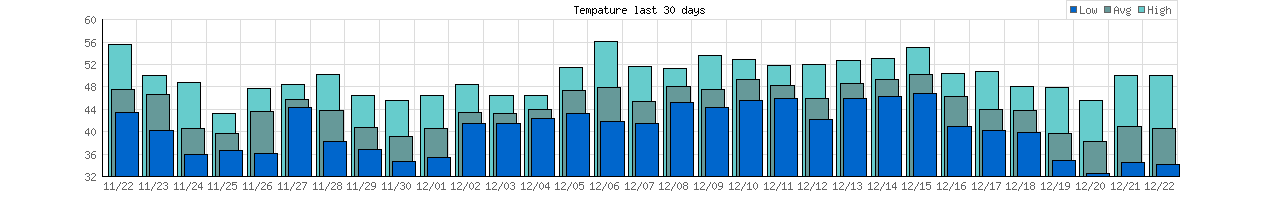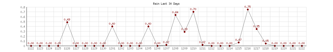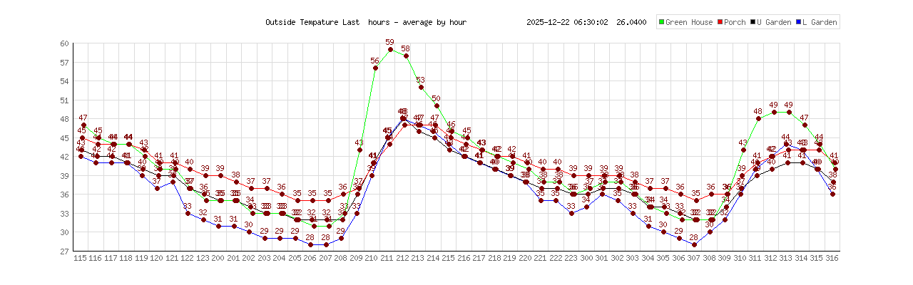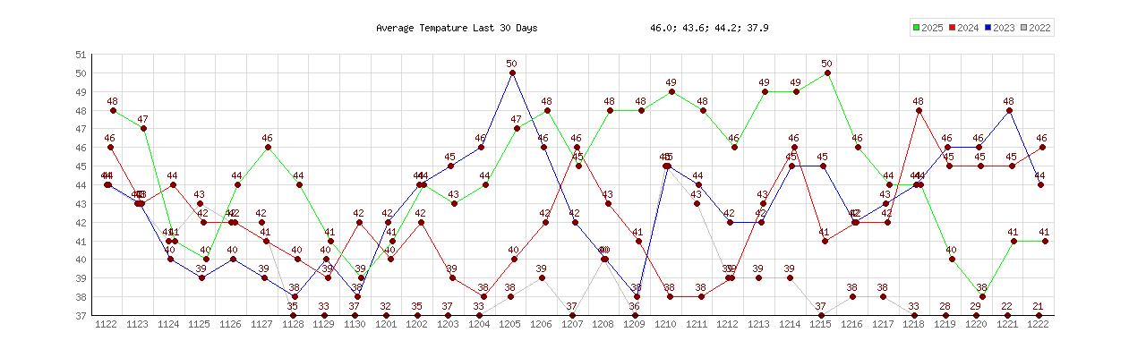 tempature at 2025-12-23 15:35:02 Outdoor Temp 43 Last Yr Rain 20.63 inches Season rain 13.8 YTD rain 13.32 inches Today's rain 0.00 Garden Temp 40